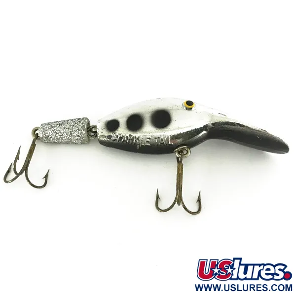 Le placage en argent confère à ce poisson nageur articulé de 8 cm une qualité réfléchissante classique qui capte la lumière sous tous les angles. Référencé sous le code produit 7223, cet Eppinger Sparkle Tail présente une section arrière distinctive recouverte de paillettes qui le distingue des leurres durs standards de son époque. Le corps est accentué par trois points noirs marqués sur le flanc, positionnés juste au-dessus du nom du modèle « SPARKLE TAIL » estampillé. Pesant 10 g, il se compose de deux segments reliés par une charnière métallique robuste, associée à une bavette conçue pour une présentation de type flottant-plongeant. Sa finition argentée est remarquablement bien conservée, avec une note d'état excellente de 5/5, bien que les hameçons triples d'origine présentent le noircissement caractéristique de l'acier vintage. Les yeux jaunes aux petites pupilles noires sont placés bien en évidence à l'avant, offrant un point de mire sur le profil métallique. Ce leurre fabriqué aux États-Unis utilise une conception basée sur la flottabilité destinée aux techniques de lancer ou de traîne.