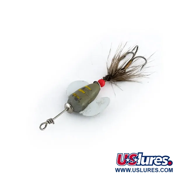 Mesurant 5 cm de l'œillet à la courbure de l'hameçon, ce Spin-n-Glo à plumes présente la silhouette indissociable de Yakima Bait. Le corps gris est accentué par trois rayures jaunes et associé à des ailes blanches, une combinaison conçue pour une visibilité accrue dans diverses conditions de rivière. D'un poids de 0,6 g (1/64 oz), ce modèle fabriqué aux USA comprend une perle rouge vif servant d'espaceur et de point focal contre l'arrière plumé. Le corps présente de légères traces d'utilisation passée, avec une finition légèrement patinée qui lui donne un caractère authentique testé sur le terrain (3,5/5). L'hameçon triple à plumes reste bien conservé, ajoutant une texture naturelle à l'ensemble. Référencé sous le code produit 9946, sa conception repose sur la flottabilité du corps et la rotation des ailes lorsqu'il est placé dans le courant.