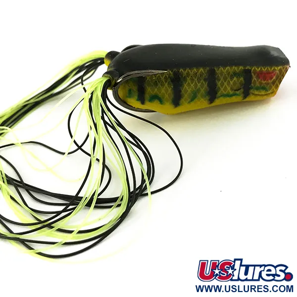 Pesant exactement 14 g (1/2 oz), ce leurre de surface au coloris perche présente des flancs jaunes marqués de zébrures verticales sombres. D'une longueur de 6 cm (2 1/4"), le SPRO Dean Rojas Bronzeye Frog Popper (référence 7148) est doté d'une bouche concave profonde pour propulser l'eau vers l'avant en surface. Sa conception à corps souple est associée à un double hameçon renforcé, permettant au plastique de s'écraser facilement pour un ferrage optimal. Une gorge rouge vif sert de point de mire supplémentaire, complétée par une longue jupe en caoutchouc noir et chartreuse. Ce modèle, de conception américaine, ne présente aucune trace d'usure sur le corps ou les hameçons (état 5/5). Le dos sombre est un choix technique de Dean Rojas pour que le leurre se détache nettement en silhouette lorsqu'il est vu depuis les profondeurs sous un couvert végétal dense.