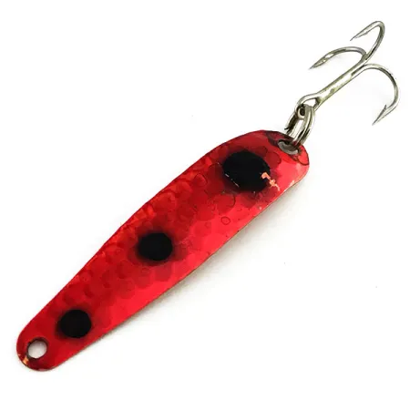 Les textures martelées comme celle de cette cuillère de 5,5 cm (2 1/4") étaient un élément de base des modèles réfléchissant la lumière pour la traîne traditionnelle. Ce Stinger Scorpio de Advance Tackle présente une finition rouge éclatante sur sa face avant martelée, accentuée par trois points noirs distincts. En retournant le leurre, on découvre un revers en cuivre poli, clairement estampillé du nom de la marque STINGER. Pesant 5 g (3/16 oz), ce spécimen fabriqué aux USA reste en condition 5/5, ses surfaces propres ayant été bien préservées au fil du temps. L'armement se compose d'un hameçon triple argenté fixé par un anneau brisé. Portant le code produit 9054, cette cuillère arbore également un chiffre 7 frappé sur le côté cuivre, faisant probablement référence à la taille de la palette ou au numéro de modèle.