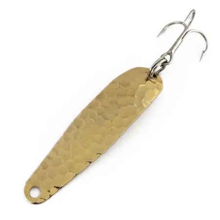 La finition Hammered Gold offre une surface multi-facettes à cette cuillère de 5,5 cm (2 1/4"), conçue pour refléter la lumière sous différents angles. Pesant 5 g (3/16 oz), cette création Advance Tackle est un outil classique de fabrication américaine pour la boîte de pêche. Le revers présente un marquage "STINGER" net, l'identifiant comme le modèle Scorpio produit sous le code produit 9723. Son état est de 5/5, affichant une surface propre et lustrée sur la base aux tons de laiton. Le leurre est monté avec un hameçon triple argenté et comprend un trou d'attache percé avec précision à l'extrémité étroite, maintenant un profil profilé pour le lancer ou la traîne.