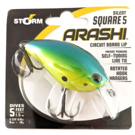 Des teintes vives de type "Parrot" passent d'un vert lime éclatant à un bleu-vert profond sur le dos de ce Storm Arashi Silent Square 5, code produit 11706. Conçu pour un contact précis avec les obstacles, ce leurre dispose d'une bavette fine en circuit imprimé permettant d'atteindre une profondeur de nage de 1,5 m. Pesant 18 g pour une longueur compacte de 6 cm, il intègre une attache de ligne auto-réglable destinée à maintenir une trajectoire rectiligne à travers les structures immergées. L'armement se compose d'hameçons VMC montés sur des œillets orientés, ce qui maintient les pointes plus près du corps pour limiter les accrocs. Ce modèle provient d'Indonésie dans son emballage d'origine et n'a jamais été utilisé. Il s'agit de la version silencieuse de la série Arashi, misant sur son profil et son déplacement d'eau plutôt que sur des billes bruiteuses.