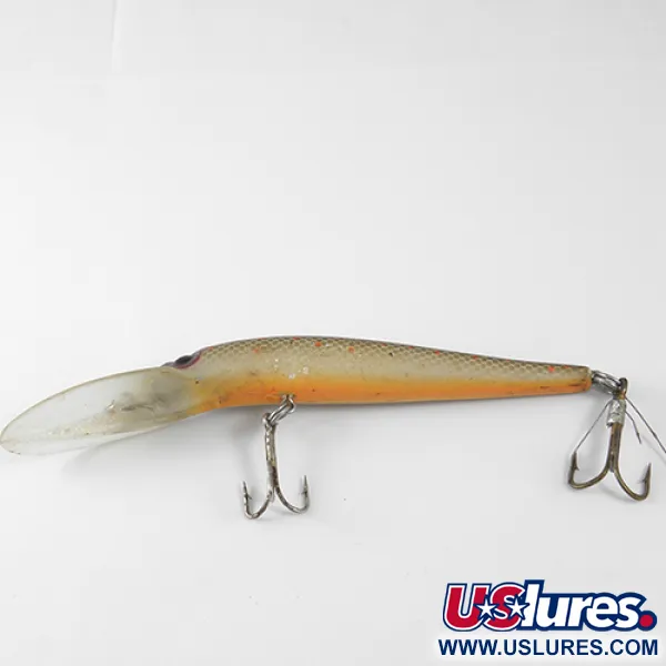 Paré d'un motif classique d'écailles olive et or parsemé de fins points orange, ce modèle illustre le savoir-faire des leurres Storm fabriqués aux États-Unis. Identifié par le code produit 1228, ce Deep Jr Thunder Stick mesure exactement 10 cm (4") pour un poids de 9 g (1/3 oz). Sa longue bavette transparente est conçue pour atteindre des profondeurs comprises entre 2 m et 4 m (6,5 ft à 13 ft), ce qui en fait un choix fiable pour traquer le sandre en eaux profondes. Son profil effilé est complété par des yeux rouges distinctifs et des hameçons triples d'origine. Côté état, le leurre est noté 4/5, ne montrant que de légers signes d'utilisation tout en conservant son éclat et son armature intacte. Les pêcheurs privilégient souvent ce design de minnow flottant pour le lancer ou la traîne au-dessus des structures où une présentation profonde est essentielle.