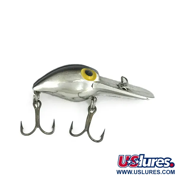 Une finition chrome argenté étincelante définit ce modèle compact, soulignant son héritage Pre-Rapala issu de la production originale de Storm aux USA. Pesant à peine 1/8 oz (4 g) pour une taille de 1 1/4" (3 cm), le Pee Wee Wart est un crankbait flottant de grande profondeur spécialisé pour la perche et le sandre. La longue bavette de plongée est clairement marquée de l'identifiant PEEWEE WART, qui reste net et lisible. Visuellement, le leurre présente un dos noir classique contrastant avec les flancs argentés, accentué par des yeux jaunes distincts aux pupilles noires. Ce leurre, répertorié sous le code 7320, est dans un état exceptionnel, noté 5/5. Les deux hameçons triples d'origine sont présents et en bon état. Produit avant l'acquisition par Rapala, il représente une ère spécifique de la fabrication de matériel de pêche américain, à l'époque où ces crankbaits de petit profil commençaient à devenir populaires pour le lancer et la traîne.