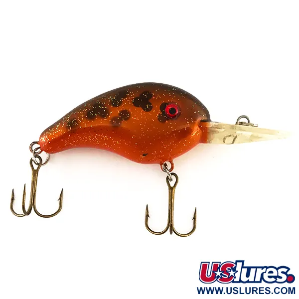 Un éclat orange doré émane du corps de ce crankbait de grande profondeur, accentué par de larges taches sombres le long du dos. Ce Strike King 4XD, identifié par le code produit 7913, est un leurre compact de 5 cm (2") conçu pour atteindre des profondeurs importantes. Pesant 10 g (1/3 oz), son profil lesté lui permet d'atteindre une zone de travail de 2,4 à 3,6 m (8 à 12 ft). Les yeux rouges vifs offrent un contraste marqué avec la finition pailletée, qui ne présente aucun signe d'usure, ce qui lui vaut une note d'état de 5/5. Modèle flottant et bruiteur, il intègre des billes internes pour générer du son au lancer ou à la traîne. La bavette longue et transparente est solidement fixée au nez, aidant le leurre à atteindre les couches profondes prisées par le sandre et le brochet. Des hameçons triples bronzés sont fixés via des anneaux brisés robustes, préservant l'intégrité de l'armement d'origine.