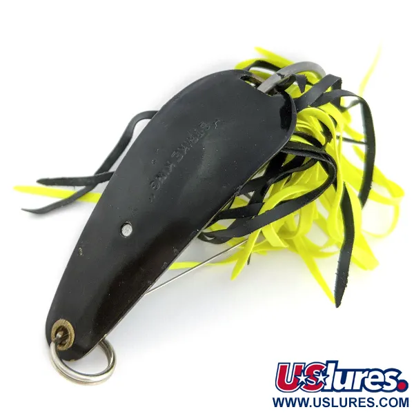 D'un poids de 14 g (1/2 oz), la Strike King Timber King est une cuillère anti-herbe classique qui témoigne de l'histoire du matériel de pêche américain. Mesurant 5,5 cm (2 1/4"), ce leurre spécifique (Code produit 17998) présente une finition noire profonde sur son corps métallique, rehaussée par une jupe en caoutchouc multibrins contrastée noire et jaune. Lancé initialement en 1979, ce modèle a été conçu pour cibler les brochets et les black-bass de taille record dans les bois morts les plus denses, à une époque où la marque se spécialisait dans les équipements pour milieux très encombrés. Sa conception comprend un hameçon simple robuste protégé par des tiges anti-herbe intégrées, lui permettant de traverser la végétation dense sans s'accrocher. Cet exemplaire est en état 5/5, conservant une surface impeccable tant sur la cuillère que sur l'anneau brisé renforcé. Arrêtée depuis longtemps, cette rareté fabriquée aux USA représente une pièce fonctionnelle du patrimoine halieutique de la fin des années 70.