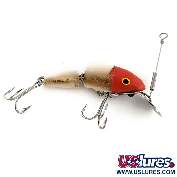 La bavette de plongée en métal de ce Suick Cisco Kid Jointed est une signature de ce design américain vintage, offrant un point de contact durable pour les présentations en profondeur. Mesurant 5 cm (2") et pesant 5,5 g (3/16 oz), ce modèle spécifique (code produit 12874) présente une finition classique à tête rouge qui transitionne vers un corps à écailles dorées et une queue blanche. Sa configuration de corps articulé est reliée par une armature métallique robuste, incluant deux hameçons triples montés sur le ventre. Un avançon en acier intégré est fixé à l'attache sur la bavette, reflétant son utilisation historique comme leurre robuste pour les eaux nord-américaines. La peinture sur les deux segments est remarquablement bien conservée avec des couleurs vives et des yeux peints en jaune et noir, classant ce leurre dans un excellent état de 5/5. Chaque composant, de la bavette en métal estampé à l'articulation, illustre le savoir-faire industriel associé aux premières séries de production de Suick.