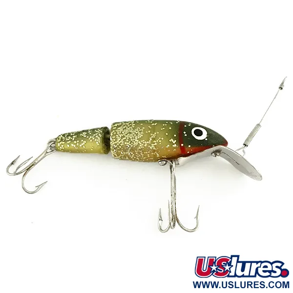 Une finition Pearl Glitter confère à ce leurre de 6,5 cm (2 1/2") une apparence frappante, avec des paillettes dorées sur un dos olive foncé qui transitionne vers un nez accentué de rouge. Ce Suick Cisco Kid Jointed, identifié par le code 6903, représente un témoin bien conservé de l'histoire du matériel de pêche fabriqué aux USA. Il pèse 9,5 g (1/3 oz) et utilise un corps articulé en deux segments conçu pour la stabilité au lancer ou à la traîne. Le segment avant est équipé d'une bavette métallique classique et d'yeux blancs et noirs proéminents, tandis que la section arrière s'affine vers l'hameçon de queue. L'armement comprend deux hameçons triples et un bas de ligne en acier d'origine fixé à l'œillet. Affichant un état de 5/5, le leurre présente des surfaces propres et des composants métalliques brillants et non ternis.