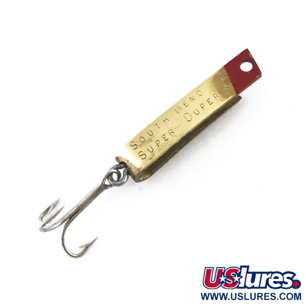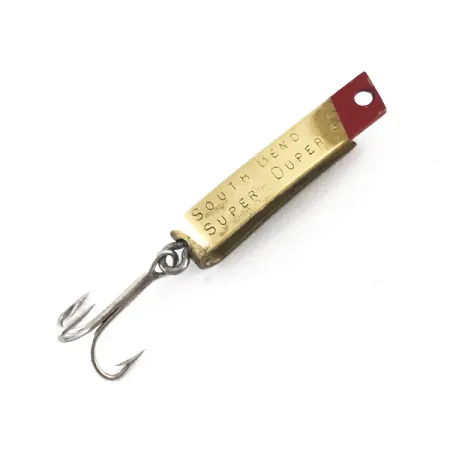 Pesant à peine 3/64 oz (1,4 g), cette minuscule cuillère métallique est un choix ultra-léger classique pour la truite et les petits poissons de sport. Le corps en laiton doré de ce Super-Duper 500 arbore le nom emblématique « SOUTH BEND SUPER-DUPER » frappé dans le métal. Au niveau de l'attache, une pointe peinte en rouge distinctif offre un contraste marqué avec la surface dorée. En retournant ce leurre de 2,5 cm (1"), on découvre le numéro de brevet historique 2719378, ancrant son origine dans la conception américaine du milieu du siècle. Ce spécimen, portant le code produit 5257, conserve son hameçon triple d'origine fixé par un anneau brisé sur la courbure en U. Le leurre présente un bel aspect avec une note de condition de 4/5, ne montrant que de légers signes d'âge sur les surfaces métalliques.