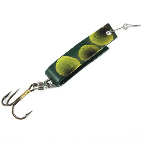 Des points jaunes sur une base vert forêt profond caractérisent le coloris Frog de ce Super-Duper 501 de 3 cm (1 1/4") de South Bend. Fabriqué à l'origine aux USA, ce modèle particulier (Code Produit 0896) présente le design classique en métal plié en U qui est un incontournable des boîtes à pêche depuis des décennies. Pesant un délicat 2,3 g (3/32 oz), le leurre est équipé d'un hameçon triple piquant relié par un anneau brisé robuste et une agrafe métallique à l'attache de ligne. La courbe intérieure du corps en métal révèle une finition vert uni avec un lettrage jaune, conservant un aspect propre qui reflète son état noté 5/5. L'application de la peinture sur le corps en métal plié est typique de la fabrication South Bend du milieu du siècle, destinée au lancer ou à la traîne avec un équipement léger.