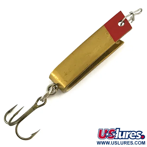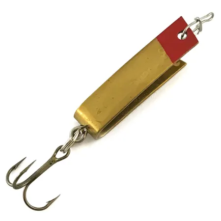 Des touches de peinture rouge soulignent la tête de ce spécimen de 2,3 g (3/32 oz), le distinguant des variantes métalliques classiques. Ce South Bend Super-Duper 501, identifié par le code produit 6278, présente une conception de corps en U unique qui combine les propriétés d'une cuillère ondulante et d'une cuillère tournante. Mesurant 3 cm (1 1/4") de long, le leurre est fabriqué à partir d'une seule bande de métal pliée avec une finition dorée brillante et le nom du fabricant frappé à l'intérieur. L'armement comprend un hameçon triple piquant attaché via un anneau brisé à la courbure inférieure et une agrafe métallique pour le raccordement du fil. Fabriqué aux États-Unis, ce leurre est dans un état 5/5, affichant une surface propre et lustrée avec une peinture bien préservée. Cette configuration de couleur spécifique est privilégiée par ceux qui recherchent un contraste élevé lors de pêches finesse de carnassiers.