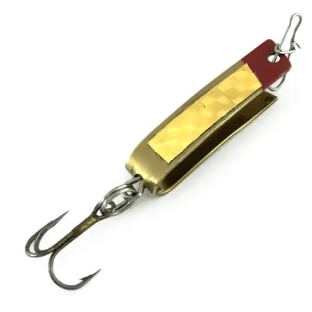 Un placage doré et une pointe rouge vif définissent le caractère visuel du South Bend Super-Duper 501, identifié par le code produit 9537. Pesant 3/32 oz (2,3 g) et mesurant 1 1/4" (3 cm), ce leurre fabriqué aux États-Unis présente une structure distinctive en métal plié en forme de U. Une bande de feuille d'or holographique texturée est appliquée sur un côté pour accentuer les reflets lumineux. L'exemplaire est en état 5/5, affichant une surface nette où le nom de marque 'SUPER-DUPER' est clairement estampillé dans le métal. Côté armement, il est équipé d'un hameçon triple robuste fixé via un anneau brisé et comprend un émerillon à agrafe pour une connexion facile au fil au niveau de la tête. La conception globale représente un mélange unique d'éléments de cuillère ondulante et tournante, caractéristique de l'approche de fabrication de South Bend du milieu du siècle.