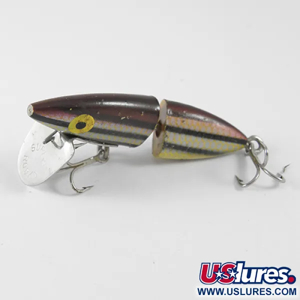 Un poids total de 5,5g (3/16oz) définit ce Rockland Super Rocky, un leurre américain vintage datant des années 1940. Identifié par le code produit 1568, le corps de 6cm (2 1/4") présente une structure articulée en deux parties destinée au lancer. Le coloris est une combinaison distincte de noir, de brun et de jaune, avec un dos métallique sombre et des rayures noires horizontales sur des flancs jaunes à écailles argentées. Une bavette plongeante métallique proéminente est fixée à la section de tête par une petite vis, juste en dessous d'yeux jaunes peints à la main avec des pupilles noires. Ce spécimen particulier est en condition 4/5, conservant une finition propre avec des signes mineurs de sa longue histoire. Des hameçons triples doubles sont montés via des pitons à visser, caractéristiques de l'accastillage utilisé à l'époque.