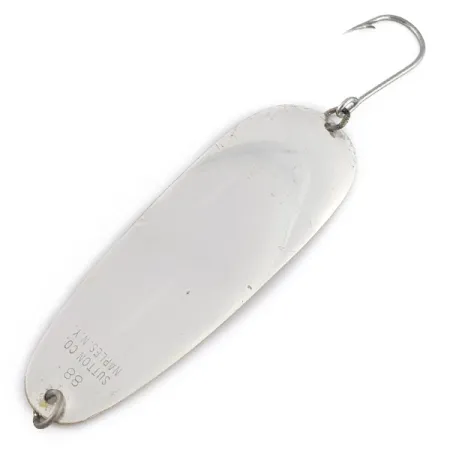 Un placage en argent sur une face et une finition en laiton doré au verso offrent un éclat polyvalent qui leurre les poissons depuis des générations. Mesurant 9 cm et pesant 7 g, sa structure en laiton extrêmement fine permet cette nage vibrante spécifique qui a rendu les leurres Sutton légendaires auprès des pêcheurs de truite et de saumon. Le marquage « 88 SUTTON CO. NAPLES, N.Y. » reste bien net sur la face argentée, identifiant son origine et son code produit 22946. Ce modèle est équipé d'un hameçon simple monté sur un anneau brisé, une configuration privilégiée pour l'efficacité des ferrages et la réduction des accrocs lors de la traîne en eaux peu profondes. Compte tenu de ses surfaces propres et de son armature intacte, le leurre affiche un état solide noté 4/5. Il offre la présentation délicate et réaliste indispensable au succès dans les eaux cristallines où les cuillères plus lourdes échouent souvent.