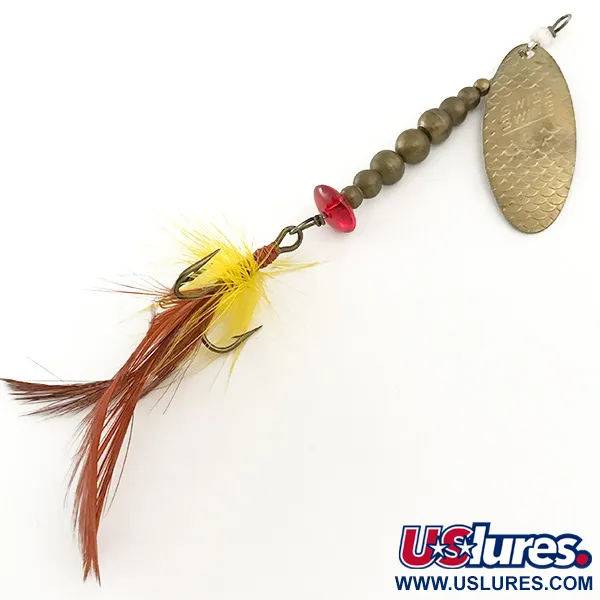 Des perles de laiton graduées jalonnent l'axe en acier de cette cuillère tournante de fabrication française, offrant un profil lesté distinct et une esthétique classique. Estampillée du nom Swiss Swing, la palette ovale en laiton présente un motif d'écailles texturées sur sa surface pour une qualité de réflexion unique. Ce spécimen, identifié par le code produit 6645, pèse 7g (1/4oz) et mesure 8,5cm (3 1/4"), ce qui en fait un choix substantiel pour la truite ou la perche. Une unique perle rouge facettée sert de point focal juste au-dessus de l'hameçon triple habillé d'une combinaison de hackles jaunes et marron. Une petite perle blanche est positionnée sur l'œillet supérieur pour faciliter la rotation fluide de l'étrier lors d'une récupération constante. Ce leurre vintage est en excellent état, noté 5/5. L'armature reste brillante et l'habillage en plumes est dense et solidement ligaturé avec du fil rouge.