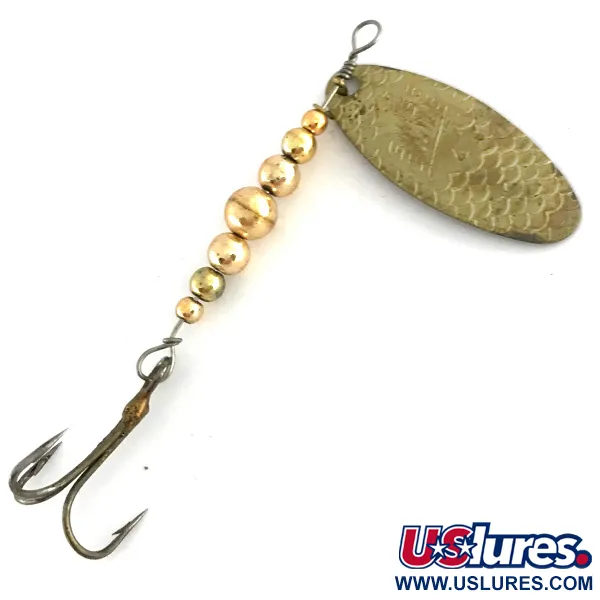 Six perles de laiton graduées forment le corps de cette cuillère tournante Renosky Lures de 2,6g (3/32oz). Connue sous le nom de Swiss Swing et identifiée par le code 8455, ce leurre de 6 cm (2 1/4") provient de France, témoignant de l'héritage du pays en matière de fabrication de matériel de précision. La palette en laiton est frappée d'une fine texture en écailles de poisson, offrant un contraste visuel marqué avec les perles polies. Une tige en acier robuste relie l'œillet supérieur à un hameçon triple à finition bronze à la traîne. Chaque composant, des perles lestées à la palette texturée, conserve sa finition en laiton. Ce spécimen est en condition 5/5, paraissant remarquablement bien conservé et conservant son éclat métallique d'origine sur toutes les surfaces.