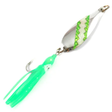 Conçue avec un véritable placage en argent, cette cuillère de traîne se distingue par sa finition de haute qualité et sa fabrication américaine. Tamiron Sporting Goods, fondée à l'origine au Canada mais produisant désormais aux États-Unis, met en avant l'artisanat local avec la série Honeybees 1 Glow. Le corps présente un ruban au motif zigzag distinct — alternant entre un vert vibrant et une finition blanche phosphorescente — appliqué sur une base réfléchissante plaquée argent. Mesurant 5,5 cm (2 1/4") et pesant 3,5 g (1/8 oz), ce modèle est spécifiquement conçu pour les applications de traîne. Sous la lumière UV, les propriétés fluorescentes du ruban deviennent très visibles, complétées par une jupe calmar verte souple montée sur l'hameçon de queue. Le revers du métal est frappé de la marque du fabricant, confirmant son authenticité. Portant le code produit 3283, ce leurre est dans un état 5/5 avec une surface propre et un armement piquant. Cette conception combine l'éclat traditionnel de l'argent avec la technologie glow moderne pour une visibilité accrue en eaux profondes.