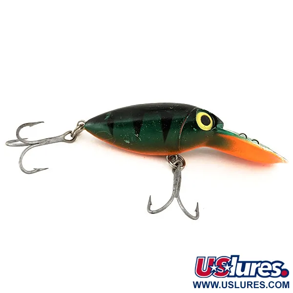 Des rayures verticales vertes sur un dos olive foncé définissent le profil visuel de ce The Producers Willy's Worm UV, une rareté classique de fabrication américaine. Pesant 8 g (1/4 oz), ce spécimen de 5 cm (2") présente un ventre orange vif qui se prolonge vers l'avant pour former une large bavette intégrée. Les yeux jaunes aux pupilles noires offrent un contraste visuel distinct avec la tête verte. Répertorié sous le code produit 11232, ce leurre se distingue par sa finition réactive aux UV sur les rayures, conçue pour capter la lumière dans diverses conditions aquatiques. L'armement se compose de deux hameçons triples en excellent état. La transition de peinture entre le dessus vert profond et le dessous orange vif reste nette, contribuant à son état 4/5. Chaque détail, de la forme arrondie du corps à l'emplacement spécifique des yeux, reflète le design caractéristique de The Producers.
