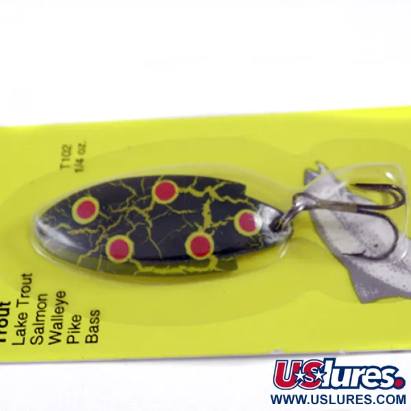 Pesant 7 g (1/4 oz), cette cuillère Thomas Buoyant de fabrication américaine est un incontournable pour la truite et de nombreux carnassiers. Son corps de 4,5 cm (1 3/4") arbore le motif « Frog », caractérisé par une base sombre avec des craquelures jaune vif et des points rouges éclatants. Présenté dans un état neuf, le leurre reste scellé dans son emballage d'origine sur carte jaune, mentionnant son efficacité pour des espèces allant de la truite grise et du saumon au brochet et au bar. Répertorié sous le code produit 0740, ce modèle comprend un hameçon triple monté en usine via un anneau brisé robuste. La mention « MADE IN U.S.A. » estampillée sur le carton confirme son origine et témoigne de la longue tradition de fabrication de la société Thomas Spinning Lures. Ce coloris spécifique, noté T102 à l'avant du blister, est conçu pour une visibilité accrue lors des lancers ou de la traîne.