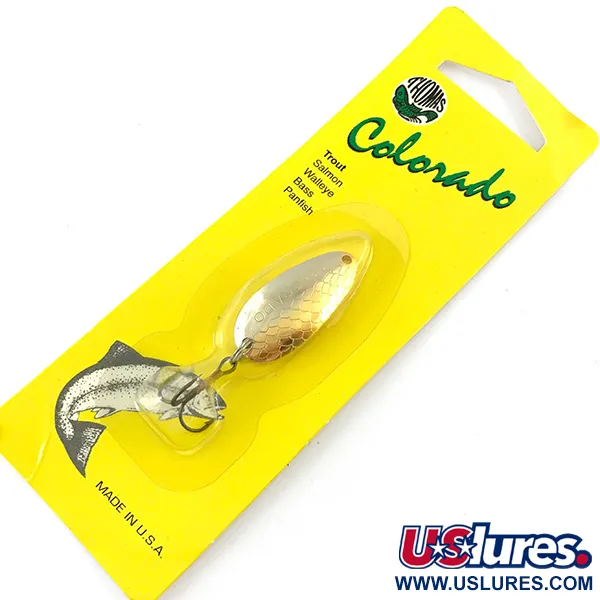 Finie avec un placage bicolore Or / Nickel frappant, cette cuillère Thomas Colorado arbore le motif classique de demi-écailles gravées conçu pour une haute réflectivité. Fabriqué par Thomas Spinning Lures, Inc. aux États-Unis, ce spécimen porte le code produit 4665 et est livré dans son emballage d'origine en carton jaune vintage. D'une longueur de 3,2 cm (1 1/4") et d'un poids de 5 g (3/16 oz), elle est dimensionnée pour cibler la truite, le saumon et le doré jaune. Le leurre est inutilisé et reste en excellent état, préservant l'éclat d'origine des surfaces métalliques. Selon les notes du fabricant au verso, cette cuillère de type ondulante est destinée à être lancée en travers ou en amont pour lui permettre de couler vers le fond pendant la récupération. L'armement se compose d'un hameçon triple robuste attaché via un seul anneau brisé, garantissant qu'elle est prête pour les méthodes de lancer traditionnelles ou de traîne.