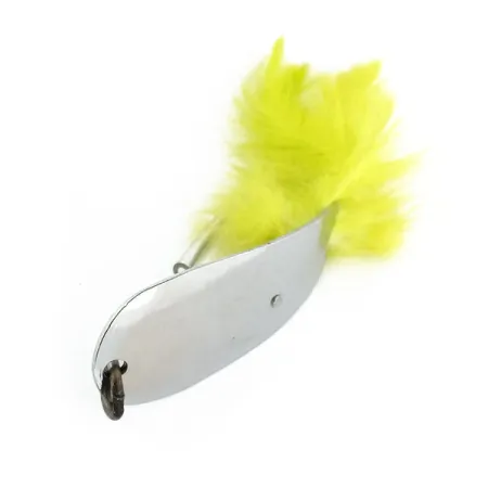 Le placage nickel confère un fini miroir à cette cuillère ondulante fabriquée aux États-Unis, une conception essentielle pour capter la lumière dans diverses conditions d'eau. Pesant 12 g (2/5 oz) et mesurant 5,5 cm (2 1/4"), cette Tony Accetta HOBO, identifiée par le code 13200, est un incontournable des boîtes de pêche du milieu du siècle dernier. Le côté concave du corps du leurre est frappé de la marque du fabricant et de « Genoa, O. », reflétant son origine américaine. Un hameçon simple est intégré au design, orné de plumes de hackle jaune vif qui créent un contraste distinct avec le métal poli. Pour faciliter la navigation dans la végétation lors des lancers, un fin garde anti-herbe en fil de fer est placé sur la pointe de l'hameçon. L'exemplaire est en état 5/5, conservant un éclat brillant sur ses surfaces nickelées et ses composants d'origine.