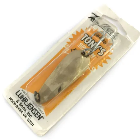 Plaquée en or 24 carats véritable, cette cuillère en métal épais est restée dans son emballage d'origine Luhr-Jensen & Sons datant de l'époque de Hood River, Oregon. Le spécimen est inutilisé et présente une note d'état de 6, reflétant sa conservation optimale sous blister transparent. Identifié par le code produit 4933-005-0599 (9488), ce leurre de 11 g (2/5 oz) mesure 5,5 cm (2 1/4") et porte un cachet de fabrication du 22/06/99 sur l'étiquette arrière. Les cuillères Tony Accetta sont reconnues pour leur conception simple par emboutissage, utilisant la finition en or 24K pour maximiser la réflexion de la lumière lors des lancers ou de la traîne. L'armement se compose d'un hameçon triple robuste à l'arrière et d'un trou pré-percé à l'avant pour une attache sécurisée du fil. Ce leurre spécifique conserve l'offre de catalogue multilingue originale au dos du carton, un détail courant dans la distribution internationale de Luhr-Jensen à la fin des années 1990.