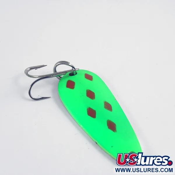 Une peinture chartreuse éclatante recouvre la face convexe de cette cuillère de 5 cm (2"), accentuée par six losanges rouges distincts offrant un contraste saisissant. Répertoriée sous le code produit 2812, cette Blue Fox Tor-P-Do fabriquée aux États-Unis est conçue sur une base métallique épaisse pesant 14g (1/2oz), ce qui en fait un choix de taille pour atteindre les zones de tenue plus profondes. Le revers présente une finition en nickel poli où la marque du fabricant et le nom du modèle Tor-P-Do sont clairement estampillés dans le métal. Un hameçon triple standard est fixé par un anneau brisé à la queue, et l'état général est de 5/5, affichant une finition bien entretenue et des graphismes nets. Le haut du leurre comprend un trou pré-percé pour une attache directe de la ligne ou un anneau brisé supplémentaire selon votre montage préféré.