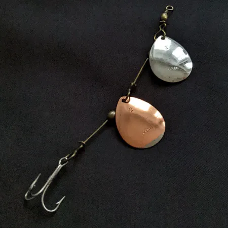 Les palettes en nickel et en cuivre offrent le contraste visuel principal sur ce modèle de 7 g (1/4 oz). Arborant deux finitions métalliques distinctes marquées du chiffre 2, le Vintage Luxon 2 Double Spinner utilise des palettes de forme goutte d'eau disposées en tandem sur une armature rigide de couleur laiton. D'une longueur de 10 cm (4"), cette rareté fabriquée aux États-Unis illustre le design fonctionnel pour lequel LUXON était réputé, privilégiant la robustesse de sa structure en corde à piano. L'ensemble est agrémenté de perles en laiton et de boucles formées avec précision pour sécuriser l'armement sans alourdir le leurre. Référencé sous le code produit 22217, ce leurre est dans un état excellent, ses surfaces métalliques ayant gardé leur éclat d'origine, ce qui justifie une note de 5/5. L'hameçon triple est monté sur une boucle standard, préservant l'aspect d'origine de l'accastillage argenté.