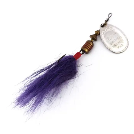 Un pompon en bucktail violet distingue ce spécimen des années 1970, offrant un contraste visuel net avec la palette à la finition argentée. Pesant 4,7 g (3/16 oz), ce leurre présente la configuration classique Mepps Aglia avec une palette de taille 2 portant l'inscription « BRITISH FRENCH PAT. » sur l'endroit et « MADE IN FRANCE » sur l'envers. Ces composants représentent l'époque où les pièces étaient fabriquées en France et assemblées aux États-Unis sous la direction de Todd Sheldon. Mesurant 5,5 cm (2 1/4") de longueur totale, la structure comprend une tige en fil d'acier massif, deux perles de corps en laiton et une perle d'espacement rouge vif positionnée juste au-dessus de l'hameçon triple habillé. Le placage en argent de la palette reste brillant, contribuant à une note d'état de 5/5. L'habillage en poils est solidement attaché, conservant son volume d'origine. Un étrier spécialisé permet à la palette de tourner autour du corps en laiton, un élément de conception fondamental de l'invention d'André Meulnart en 1938. Cet article spécifique, identifié par le code produit 10130, constitue un exemple bien conservé du profil de cuiller tournante le plus reconnu au monde.