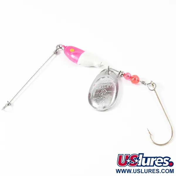 L'identification de ce Walleye Wonder 3, code produit 3572, fabriqué par South Bend, est clairement estampillée sur la palette à finition nickel. Pesant 17g (3/5oz), le leurre présente une tête bicolore distinctive avec une face avant rose vif passant à une section arrière blanche, accentuée par un petit point oculaire jaune. La structure suit une conception classique de spinnerbait de type "épingle de sûreté", originaire des USA. Entre la palette de taille 3 et l'hameçon simple de grande taille, l'armature métallique est garnie de deux perles facettées orange-rose et de petites entretoises en nickel. Ce spécimen est en excellent état, noté 5/5, avec une peinture impeccable et des composants métalliques brillants. Le logo profondément gaufré sur la palette reste net et lisible, reflétant la qualité de fabrication du matériel de pêche vintage South Bend.