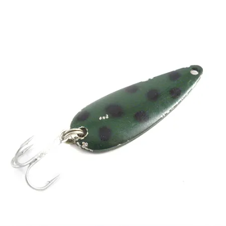Une peinture mouchetée verte recouvre la face convexe de cette cuillère ondulante de 6 cm en forme de goutte, lui donnant un aspect classique qui rappelle le matériel américain testé sur le terrain autrefois. Le nom de la marque Weber est clairement estampillé sur le dessous argenté, confirmant son origine de l'époque manufacturière américaine. Pesant 12 g, le corps en métal massif présente des signes visibles du temps passé dans une boîte à pêche, avec une note d'état de 3/5. On observe une usure authentique avec de légères pertes de peinture sur les bords et un peu d'oxydation sur la surface métallique, ce qui ajoute à son caractère vintage. Ce spécimen spécifique, identifié par le code produit 2861, est équipé d'un seul hameçon triple attaché via un anneau brisé à la base. Sa conception simple et fonctionnelle est caractéristique de l'accent mis par Weber sur l'utilité pour le lancer comme pour la traîne. Un trou de fixation propre est percé à l'extrémité étroite, garantissant qu'il reste un incontournable pour les collectionneurs de leurres métalliques traditionnels.