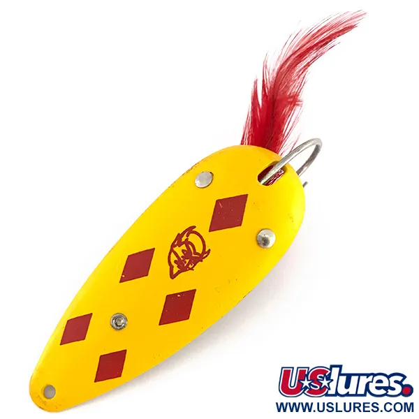 Les motifs de losanges rouges distinctifs sur une finition jaune éclatante identifient immédiatement ce motif « Five of Diamonds » comme une palette classique d'Eppinger. Mesurant 7 cm (2 3/4") et pesant 21 g (3/4 oz), ce modèle Dardevlet est un choix polyvalent de taille moyenne pour diverses conditions d'eau. Cette version spécifique dispose d'une configuration anti-herbe, comprenant un hameçon simple protégé par un garde-fil double et orné d'un plumage rouge vif. L'armature reste solide et les plumes rouges sont denses et bien conservées. Frappé clairement sur le revers aux tons laiton, le logo emblématique de la tête de diable confirme son héritage de l'entreprise que Lou Eppinger a installée à Dearborn, Michigan, en 1959. Ce leurre noté 5/5 est en excellent état, présentant une finition propre et brillante sur la face et un revers lumineux non oxydé. Le code 7907 identifie cette cuillère ondulante robuste, conçue pour naviguer dans la végétation où les hameçons standards pourraient s'accrocher.