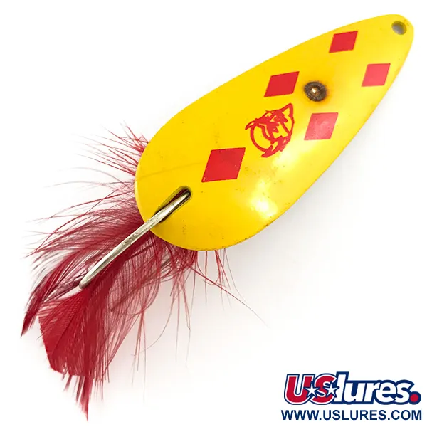 Cinq losanges rouges audacieux se détachent sur l'émail jaune vif de cette cuillère ondulante américaine emblématique. Pesant 11 g (2/5 oz) et mesurant 5,5 cm (2 1/4"), cette Eppinger Weedless Dardevle Imp, code produit 4263, est une leçon de design vintage fonctionnel. La face avant présente le profil classique « Imp », avec le logo du diable Eppinger estampé qui est la marque de fabrique de l'entreprise depuis ses origines à Détroit. Pour affronter la végétation dense, elle est équipée d'un hameçon simple protégé par un garde-herbe robuste en fil de fer et accentué par un trailer en plumes rouges bien fourni. Ce spécimen est en excellent état, affichant une finition brillante et des graphismes nets qui lui valent une note de 5/5. Le dos doré de la cuillère est propre, reflétant la qualité de fabrication de l'usine de Dearborn, dans le Michigan. Elle est conçue spécifiquement pour être lancée dans les zones encombrées comme les nénuphars ou les roseaux où un triple hameçon standard s'accrocherait facilement.