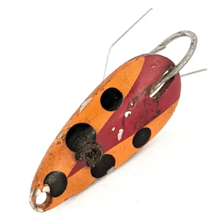 Pesant 6 g (3/16 oz), cette cuillère vintage arbore un motif distinctif rouge, noir et marron sur une base classique en nickel. Mesurant 3,5 cm (1 1/2"), la Weedless Dardevle Midget (Code produit 12857) est construite avec la forme concave emblématique qu'Eppinger produit depuis 1906. La face avant présente des points noirs audacieux sur un design bicolore, tandis que le revers affiche le nom du fabricant estampillé sur la surface en nickel poli. Un hameçon simple avec un garde anti-herbe en fil de fer l'identifie comme un outil spécialisé pour pêcher dans la végétation dense. La finition reste en condition 4/5, montrant des surfaces bien entretenues qui reflètent son origine américaine du Michigan. Le garde en fil épais est conçu pour dévier les obstacles, une caractéristique technique cohérente avec la longue histoire de la marque dans la création de matériel durable pour les conditions difficiles.