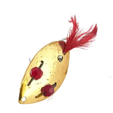Des perles rouges facettées sont incrustées dans le corps de la cuillère dorée, offrant un point focal visuel sur ce spécimen de 4,5 cm. Identifiée par le code produit 8837, cette Weedless Herter’s représente une époque où la marque américaine emblématique collaborait avec des fabricants japonais pour produire du matériel fonctionnel. L'armement se compose d'un hameçon simple protégé par un dispositif anti-herbe en fil de fer, destiné à la pêche dans les zones encombrées. Une touffe de plumes rouges vives est fixée à la queue, ajoutant une texture souple au métal rigide. Pesant 6 g, ce leurre conserve un aspect propre et brillant, comme en témoigne son état de conservation noté 5/5. Le plaquage à l'or est remarquablement bien préservé sur toute la surface du corps en forme de goutte d'eau.