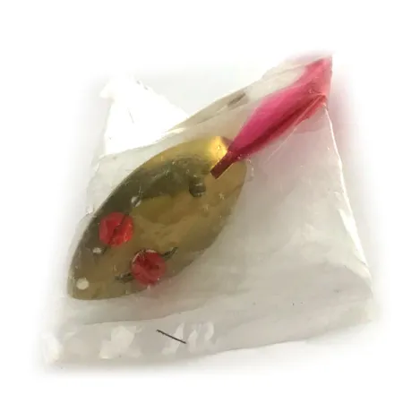 Mesurant 4,5 cm (1 3/4"), le modèle Weedless Herter's 9232 présente un corps plaqué or poli, agrémenté de deux perles rouges translucides. Ces perles sont fixées directement à travers la cuillère par une armature métallique, un choix de conception classique de cette époque de fabrication japonaise. Pesant 6 g (3/16 oz), ce leurre utilise un hameçon simple protégé par un garde anti-herbe en fil de fer pour permettre de lancer dans la végétation dense. Un trailer en plumes roses vives est attaché à l'hameçon, offrant un contrepoint visuel à la finition dorée métallique. Cet article particulier n'a jamais été utilisé, conservant les surfaces impeccables et les couleurs éclatantes de sa production originale. L'œillet d'attache est proprement découpé à l'extrémité effilée de la cuillère, à l'opposé de l'hameçon garni de plumes.