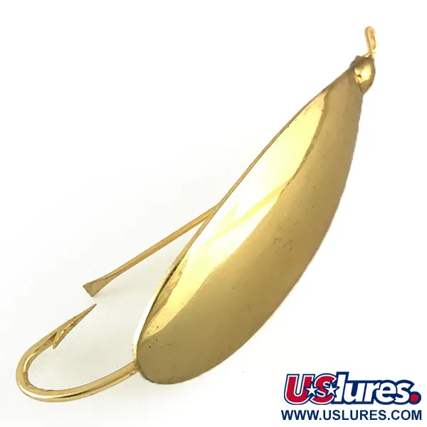 Brillant avec une finition dorée classique, ce spécimen représente la célèbre conception anti-herbe perfectionnée par Louis Johnson en 1920. Pesant 6 g (3/16 oz), la construction en alliage cuivre/zinc spécifique de cette cuillère est plus épaisse au milieu, ce qui favorise la stabilité lors de la récupération. Cette Weedless Johnson Silver Minnow, identifiée par le code produit 6698, mesure 4,5 cm (1 3/4") et arbore l'emblématique hameçon protégé intégré pour pêcher dans la végétation dense. Notée 5/5, ce leurre présente le placage de haute qualité typique des stocks anciens fabriqués aux USA avant la délocalisation de la production. La surface dorée produit des flashs vers le bas et les côtés alors que le corps bascule sur un angle de 270 degrés. Comme le balancement reste constant même avec un trailer, de nombreux collectionneurs et pêcheurs l'associent encore à de la couenne de porc (pork rind) pour imiter un poisson fourrage en détresse. L'hameçon simple est orienté vers le haut pour éviter les accrocs tout en restant dégagé pour les attaques venant d'en bas.