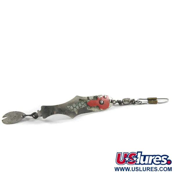 Un placage en nickel recouvre le corps de cette cuillère de 3 cm (1 1/4"), souligné par une tête distinctive peinte en rouge et un subtil motif d'écailles gravé dans le métal. Répertorié sous le code produit 2435, le Weedless Pflueger Wobbler dispose d'un garde-herbe fonctionnel en fil de fer fixé par une vis proéminente sur le dessous — une signature de l'approche mécanique de Pflueger pour une pêche sans accrocs. Fabriqué aux USA, ce spécimen léger de 1,4 g (3/64 oz) reste dans un état de 4/5, avec l'armature incluant l'émerillon avant et l'agrafe toujours solidement fixés. Une petite palette en forme de pétale est reliée à l'arrière, ajoutant un point de mouvement secondaire pour le pêcheur. L'estampillage au dos reste remarquablement net, affichant les identifiants 'MADE IN USA' et 'PFLUEGER WOBBLER' sur la surface métallique polie.