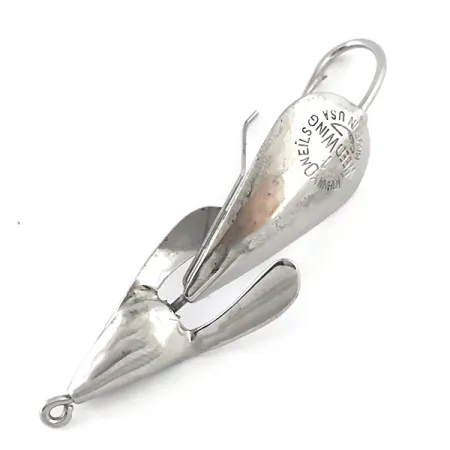Estampillée « JOHNNIE O'NEILS WEED WING » directement sur le métal, cette cuillère de 7 g (1/4 oz) à la finition nickelée témoigne de l'innovation américaine en matière de matériel de pêche du milieu du siècle. Mesurant 5,5 cm (2 1/4"), ce leurre présente un hameçon simple renforcé intégré à son corps ailé unique, un design conçu par Johnnie O'Neil à Akron, Ohio, à la fin des années 1950. Un garde anti-herbe fixe en fil de fer reste parfaitement aligné sur la pointe de l'hameçon pour faciliter les lancers dans les nénuphars denses ou les débris. La surface métallique de ce spécimen, répertorié sous le code 5266, conserve un éclat élevé, justifiant un état de 5/5. Son nez est équipé d'un œillet d'attache standard, et le dessous révèle l'assemblage propre et fonctionnel caractéristique des premières séries de production avant que la marque ne passe sous le giron de Harrison Industries.