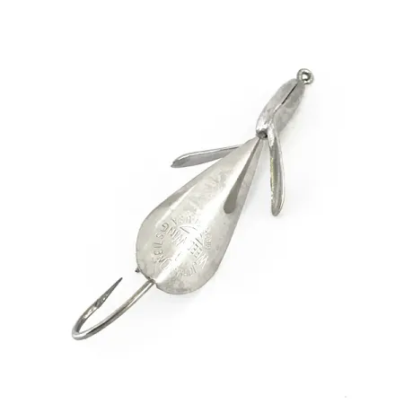 Des stabilisateurs à double aile positionnés juste derrière l'œillet confèrent au Weedless Weed Wing Jonny ONeils 1 son profil unique. Pesant 1/4 oz (7 g), le corps en finition nickel a été une innovation majeure pour Johnnie O'Neil lorsqu'il a lancé ce concept en 1957 à Akron, Ohio. Ce spécimen mesure 2 1/4" (6 cm) de long et est équipé d'un hameçon simple robuste protégé par un garde-herbe flexible pour pêcher dans les milieux encombrés. Les archives indiquent qu'après l'obtention de son brevet en 1962, la production a été transférée à Harrison Industries au milieu des années 1960. Ce modèle, portant le code produit 8274, présente des estampilles de fabricant nettes sur son corps de cuillère en forme de larme. L'armature reste solide et les surfaces réfléchissantes sont brillantes et bien entretenues, justifiant une note d'état de 5/5.