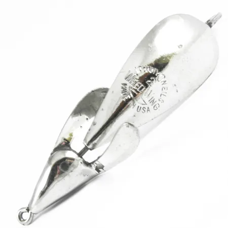 Frappé directement sur la surface en nickel poli de cet exemplaire, le marquage « Johnnie O'Neils Weed Wing Made in USA » l'identifie comme un grand classique de l'histoire du matériel de pêche de l'Ohio. Pesant 1/3 oz (9 g) pour une longueur de 2 1/4" (6 cm), le corps principal se compose d'un nez lesté en plomb couplé à une aile métallique pivotante. Cette cuillère de couleur Nickel utilise un hameçon simple robuste tourné vers le haut, protégé par un fin garde anti-herbe en fil de fer, une conception spécifiquement prévue pour lancer directement dans les herbiers denses ou les nénuphars. L'accastillage de cet article, identifié par le code 3523, témoigne de la lignée du design de 1957 de Johnnie O'Neil avant la transition de la marque vers Harrison Industries au milieu des années 1960. Concernant sa conservation, cette cuillère est en condition 4/5, conservant un aspect propre et brillant sur les surfaces métalliques et une connexion solide et intacte à l'œillet de tête.