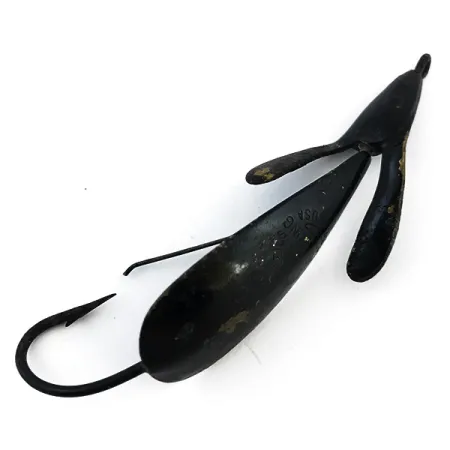 Pesant 9 g (1/3 oz), cette cuillère ondulante en métal à la forme distinctive représente une pièce importante de l'histoire de la pêche dans l'Ohio du milieu du XXe siècle. Johnnie O'Neil a développé le Weed Wing en 1957 à Akron, dans l'Ohio, obtenant un brevet en 1962 avant que le concept ne soit racheté par Harrison Industries. Ce spécimen de 6 cm (2 1/4") arbore une finition noire unie et est conçu pour naviguer dans la végétation dense grâce à son dispositif anti-herbe en fil de fer protégeant l'hameçon simple. Les "ailes" uniques positionnées près de l'œillet distinguent le design d'O'Neil, répertorié sous le code produit 5066. Des marquages estampillés sur le corps de la cuillère confirment sa fabrication aux USA. Le revêtement noir présente une légère usure sur les bords, témoignant de son séjour dans une boîte à pêche, tandis que le métal et l'armature restent robustes, pour une note d'état de 4/5.