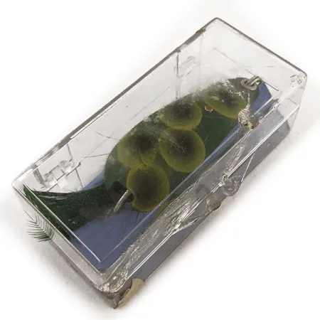 Une base vert forêt profond sert de toile au motif emblématique Frog, qui utilise des taches sombres bordées de jaune pour créer un contraste visuel élevé pour les black-bass cachés dans la végétation. Pesant 12,5 g (2/5 oz), cette Weezel Rex Weedless Spoon est dans un état neuf, ayant été remarquablement bien conservée dans son étui en plastique transparent d'origine. La lame métallique de 5,5 cm (2 1/4") présente un hameçon simple distinctif protégé par un garde-herbe en acier à ressort, une caractéristique de conception qui a établi Weezel Bait Co comme un leader de la pêche en milieu encombré avant que la marque ne soit finalement acquise par Eppinger. Un habillage de plumes vert foncé est attaché à l'hameçon, ajoutant une texture douce et naturelle à l'ensemble. Les collectionneurs reconnaîtront le code produit 11661 associé à cette variante spécifique fabriquée aux États-Unis. La finition est d'une propreté remarquable, témoignant du savoir-faire de haute qualité de la production de matériel de pêche américaine d'époque.
