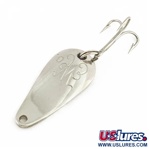 Mesurant précisément 2,7 cm (1"), son corps en métal poli présente une forme élégante en goutte d'eau conçue pour des lancers précis. Estampillée sur la surface, une lettre « W » calligraphiée identifie cette Weller Gypsy King Deluxe (Code produit : 24432) comme une pièce historique du matériel de pêche américain. Le leurre conserve une finition brillante et réfléchissante sur son armature de 3,5 g (1/8 oz) et affiche un état de 5/5. Un anneau brisé robuste relie la cuillère à un hameçon triple propre, garantissant que l'armement reste en excellent état. Bien que répertorié comme étant en cuivre, le placage argenté visible est exempt de marques ou de rayures. L'œillet d'attache à l'extrémité avant est bien défini, prêt pour une utilisation sur des lignes légères ou pour une présentation verticale.