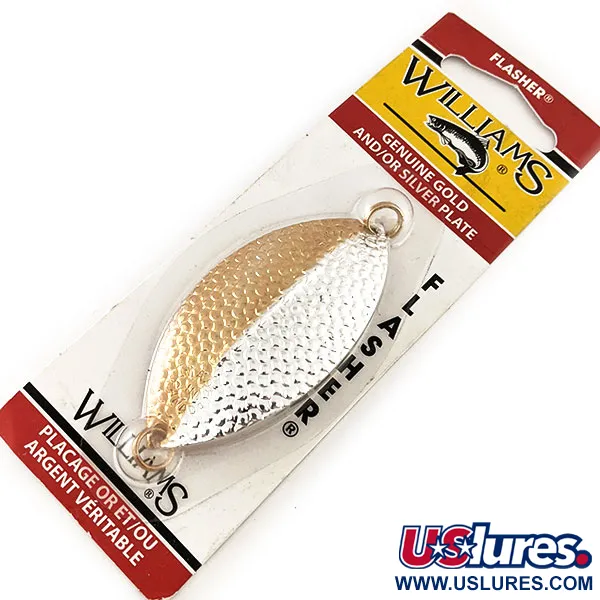 Un véritable placage en or 24 carats et en argent recouvre la surface martelée de cette cuillère fabriquée au Canada, offrant un éclat bicolore conçu pour une grande visibilité dans diverses conditions d'eau. Mesurant 7 cm (2 3/4") et pesant 9 g (1/3 oz), la Williams Flasher F1 présente une arête stabilisatrice centrale pour l'aider à maintenir un mouvement régulier lors d'une récupération lente. Ce spécimen porte le code produit 11670 et est inutilisé, conservé dans son emballage vintage d'origine de Sherbrooke, Québec. Le fabricant recommande de la monter comme attracteur suivi d'un bas de ligne de 30,5 cm à 61 cm (12" à 24") relié à un leurre plus petit, un montage souvent utilisé pour viser le touladi ou le grand brochet. Chaque élément technique, y compris la finition en métal précieux et le nom de la marque estampillé, souligne la qualité associée à la marque Williams.
