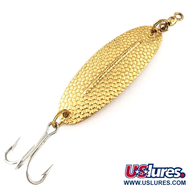 La finition Or martelé confère à ce classique canadien de 18 g (2/3 oz) une surface texturée et réfléchissante qui imite les écailles naturelles tout en captant la lumière sous plusieurs angles. D'une longueur de 8,2 cm (3 1/4"), ce Williams Wabler arbore la nervure longitudinale surélevée signature du fabricant — une caractéristique structurelle conçue pour maintenir la stabilité lors de diverses vitesses de récupération. Portant le code produit 12284, ce leurre illustre le placage de haute qualité qui fait la renommée de Williams, emblème de leur série la plus reconnue, souvent utilisée pour la pêche du brochet ou du sandre. L'armement de ce spécimen comprend un hameçon triple robuste fixé par un anneau brisé et un émerillon baril à l'avant pour limiter la torsion du fil. Évalué à 5/5, les surfaces métalliques et l'armement paraissent propres et bien conservés. Ce modèle 12284 représente une étape importante de l'histoire du matériel de pêche canadien, spécifiquement conçu pour offrir des performances constantes grâce à sa géométrie matricée unique.