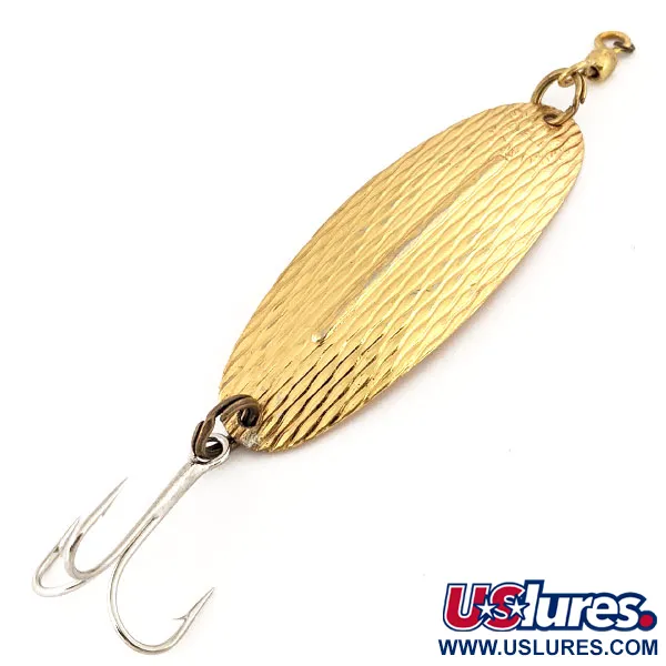 Mesurant 8,5 cm (3 1/4"), l'arête longitudinale distinctive de cette cuillère fabriquée au Canada est sa caractéristique physique la plus marquante. Cette Williams Wabler, identifiée par le code produit 12654, arbore une finition Or classique sur une surface texturée conçue pour capter et refléter la lumière. Pesant 18 g (2/3 oz), le corps métallique conserve un éclat brillant, lui valant une note d'état de 5/5. L'armement se compose d'un hameçon triple argenté et d'un émerillon de couleur laiton attaché à l'avant. Les collectionneurs apprécieront le marquage clair du fabricant sur la face concave, gage des standards de production de Williams. La conception structurelle repose sur cette nervure centrale surélevée, qui assure la stabilité du corps métallique lors des lancers ou de la traîne. Ce spécimen représente un pilier de l'histoire du matériel de pêche canadien, configuré pour cibler le brochet et le doré.