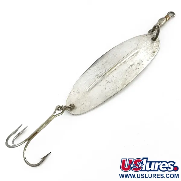 Un placage d'argent véritable caractérise la finition de ce classique canadien de 8,2 cm (3 1/4"), gage d'une visibilité optimale dans diverses conditions d'eau. Référencée sous le code 8446, cette cuillère présente l'arête longitudinale signature qui stabilise le corps métallique lors d'une récupération linéaire. Avec un poids de 18 g (2/3 oz), elle offre une masse substantielle pour les lancers à longue distance ou la traîne contrôlée du brochet et du sandre. L'armement est fiable, composé d'un hameçon triple robuste fixé par un anneau brisé à l'arrière, tandis que l'avant est équipé d'un émerillon fonctionnel pour limiter le vrillage du fil. Ce spécimen est en état 4/5, montrant des surfaces argentées bien conservées avec seulement de légères traces d'utilisation. Estampillé du logo du fabricant sur la face inférieure, le métal conserve ses propriétés réfléchissantes uniques sans l'éclat agressif d'un chromage standard.
