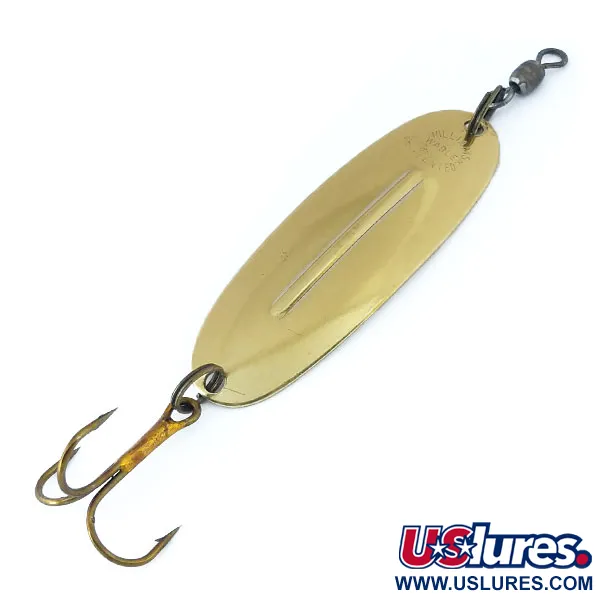 Une nervure longitudinale estampée parcourt le centre de cette cuillère de 5,2 cm (2"), servant d'élément de stabilisation emblématique du design Williams. Pesant 7 g (1/4 oz), cette Wabler W40 à finition dorée est un exemple classique du savoir-faire canadien de Williams (Code produit 10962). Ce modèle spécifique présente la crête emblématique développée pour la première fois en 1914 à Buffalo, bien que la production ait été centralisée au Canada en 1978. Alors que de nombreuses cuillères Wabler sont célèbres pour leur placage en argent, cette variante de couleur dorée offre un éclat métallique distinct visant à attirer le brochet et le doré lors du lancer ou de la traîne. L'armement reste robuste, comprenant un hameçon triple solidement fixé à la queue et un émerillon à rotation fluide à la tête pour gérer la torsion de la ligne. Un estampillage net du fabricant est visible près du trou supérieur, reflétant l'héritage d'un design qui est resté un incontournable des boîtes à pêche depuis les années 1920.