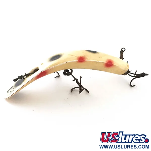 Une base de couleur crème accentuée par de larges points noirs et rouges fait de ce spécimen un ajout remarquable à toute collection. D'une longueur de 9 cm (3 1/2") et d'un poids de 9 g (1/3 oz), il présente la courbure emblématique de la lignée Yakima Bait Worden Flatfish. Identifiée par le code 4791, sa conception intègre le traditionnel harnais écarteur à plusieurs hameçons, un détail technique destiné aux animations à très faible vitesse. La finition reste brillante et nette, avec une note d'état de 4/5, tandis que l'armature métallique témoigne de son origine vintage tout en restant robuste. Les collectionneurs apprécieront l'alignement peint à la main du motif tacheté, qui suit les contours du corps vers la queue effilée.